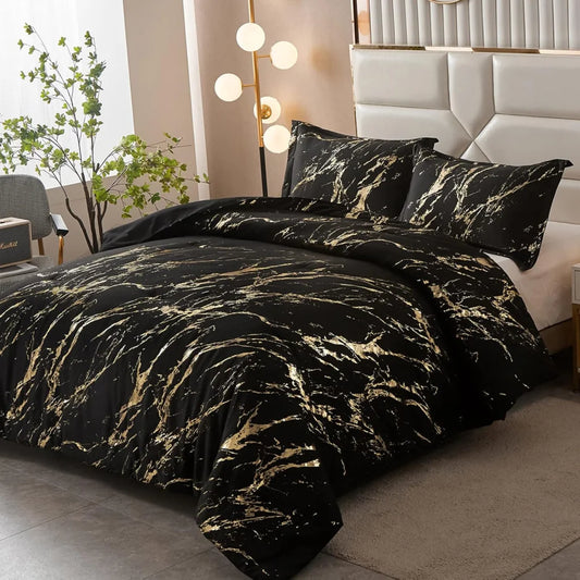 Comforter Set Black Gold Metallic Marble King Size Foil Print Glitter 3-Piece Bedding