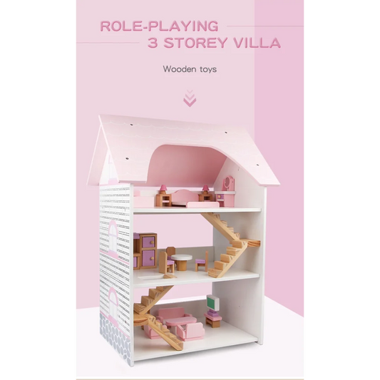 Wooden DIY Dolls Doll House 3 Level Kids Pretend Play Toys Full Furniture Set Pink