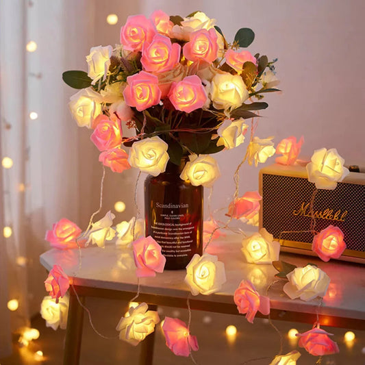 20 Pink n White Rose 3D Fairy Lights 3M String, Battery (AA) Indoor & Outdoor Decorations Wedding Valentines Romantic Room Table Lighting