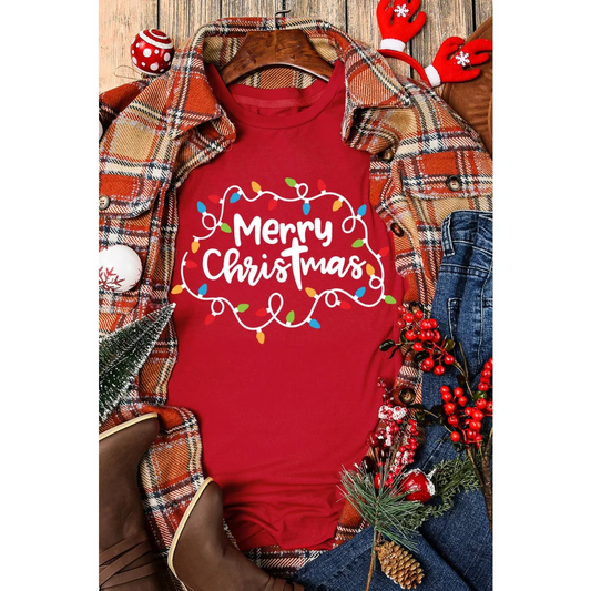 Red Merry Christmas Lights Print Crew Neck T Shirt - S