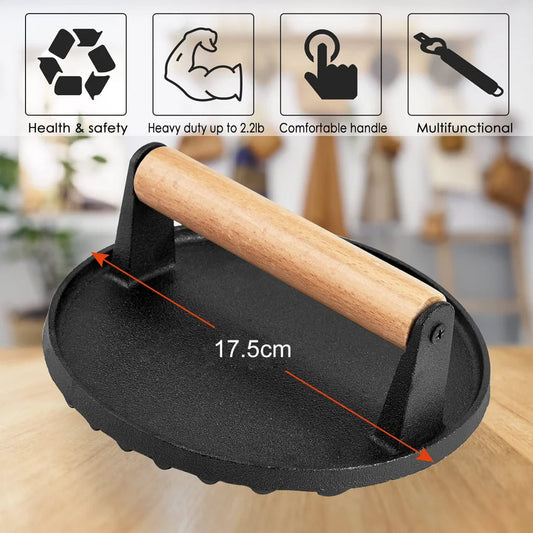 Grill Press Heavy Duty Round Cast Iron for Burger Steak Griddle BBQ Grilling - Pre-Seasoned