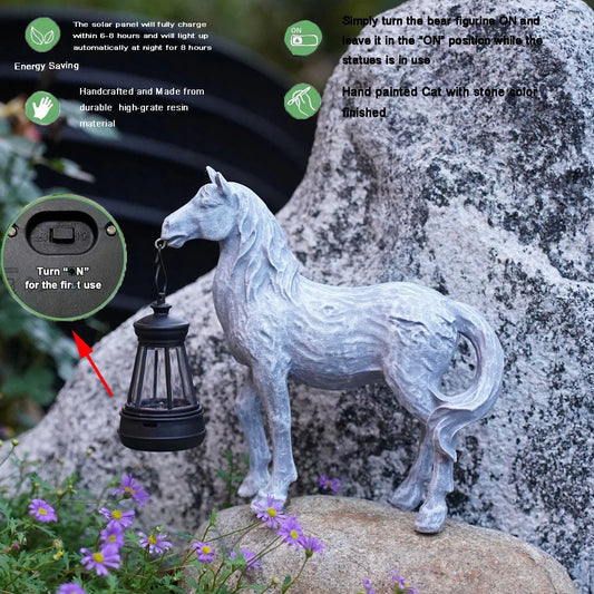 Grey Solar-Powered Horse Statue with LED Lantern – Rustic Outdoor Garden Ornament