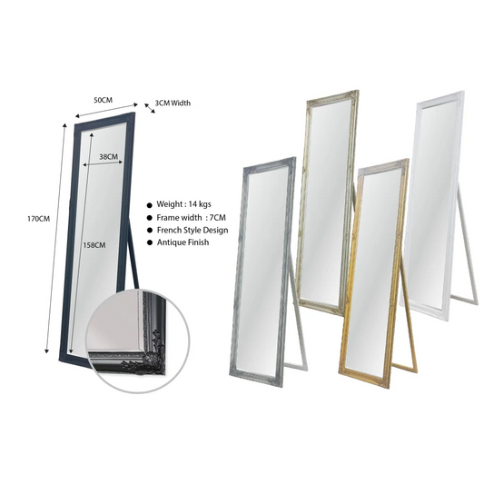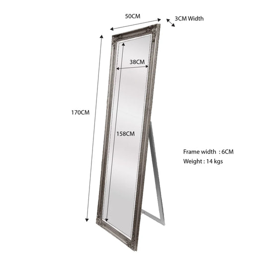 French Provincial Ornate Mirror - Antique Silver - Free Standing 50cm x 170cm