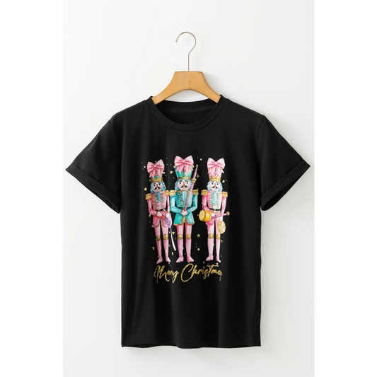 Black Nutcracker Merry Christmas Printed Crewneck T Shirt - S