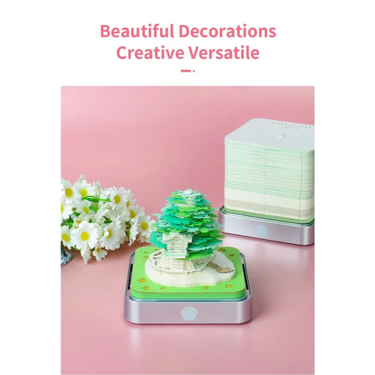 Green Tree House Blossom 3D Paper Sculpture Night Light with Memo Pad, Black Base - Elegant Gift Set for Home & Office