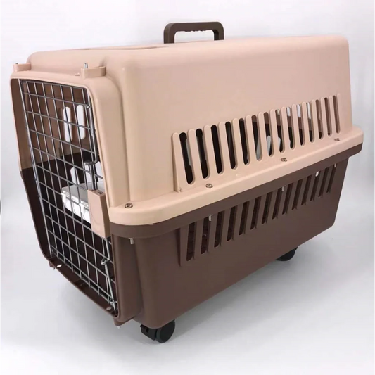 Pet Carrier Large Brown Dog Puppy Cat Crate with Tray, Bowl & Wheel