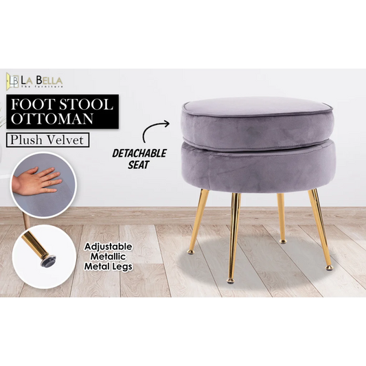 Ottoman Foot Stool Velvet Fabric Metal Leg Round - Grey