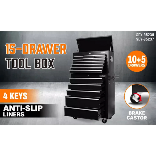 Black15 Drawer Tool Box Trolley Cabinet Storage Cart Garage Toolbox Organiser