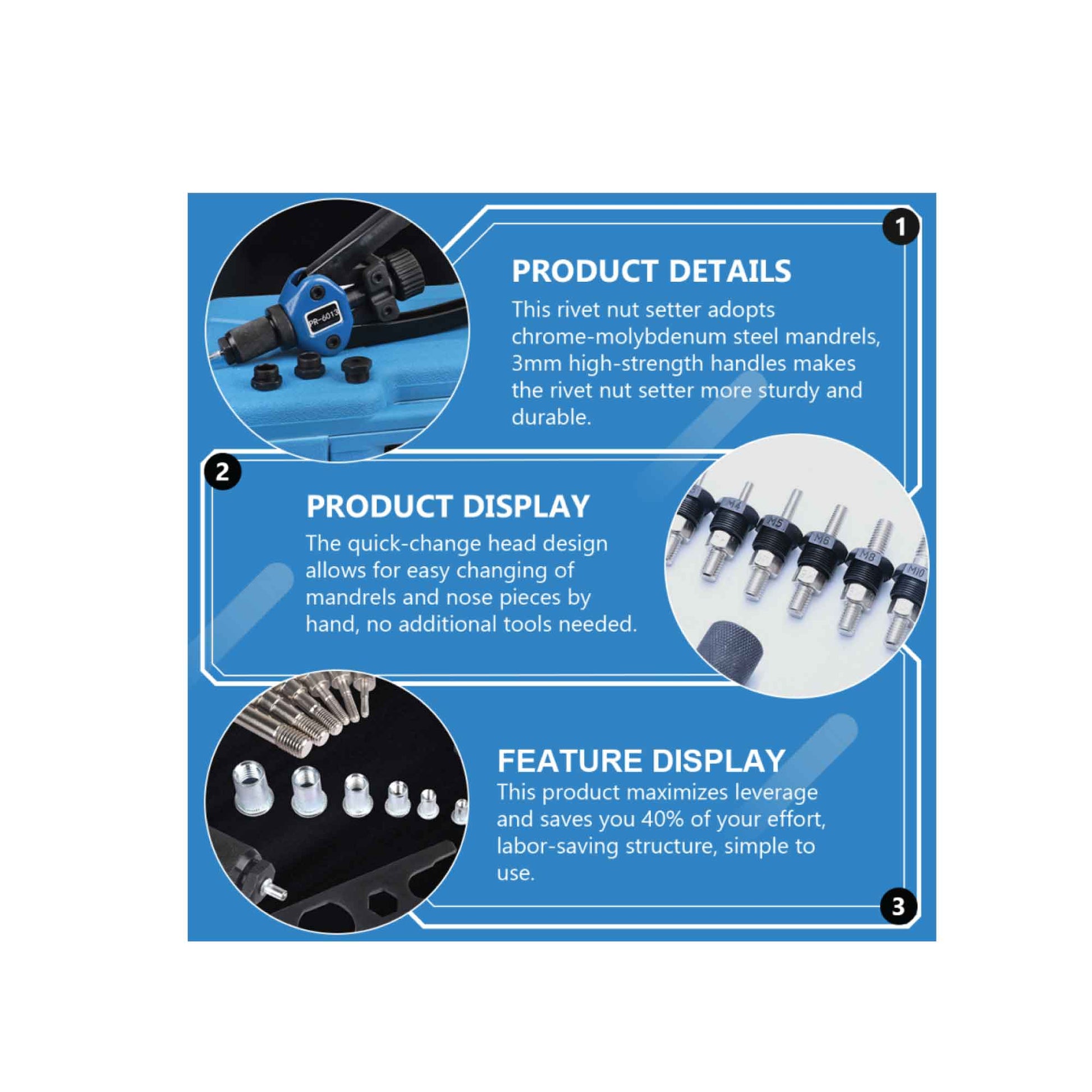 - Advanced Material: This rivet nut gun adopts chrome-molybdenum steel mandrels, 3mm high-strength handles makes the rivet nut gun more sturdy and durable