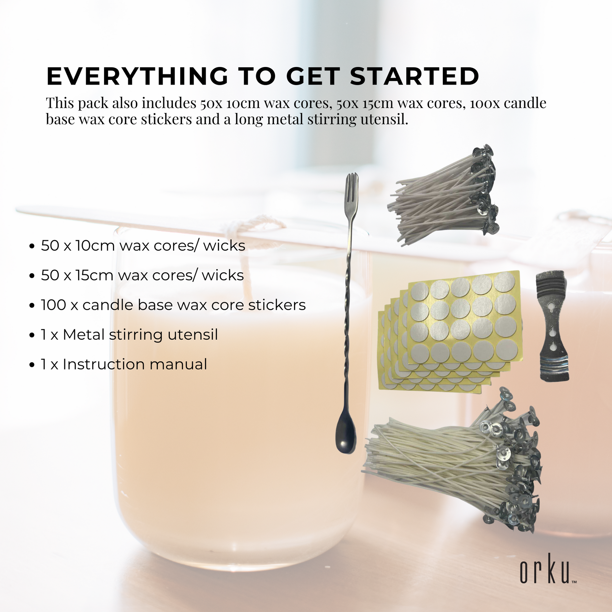 This pack includes 50x 10cm wax cores, 50x 15cm wax cores, 100x candle base wax core stickers and a long metal stirring utensil.