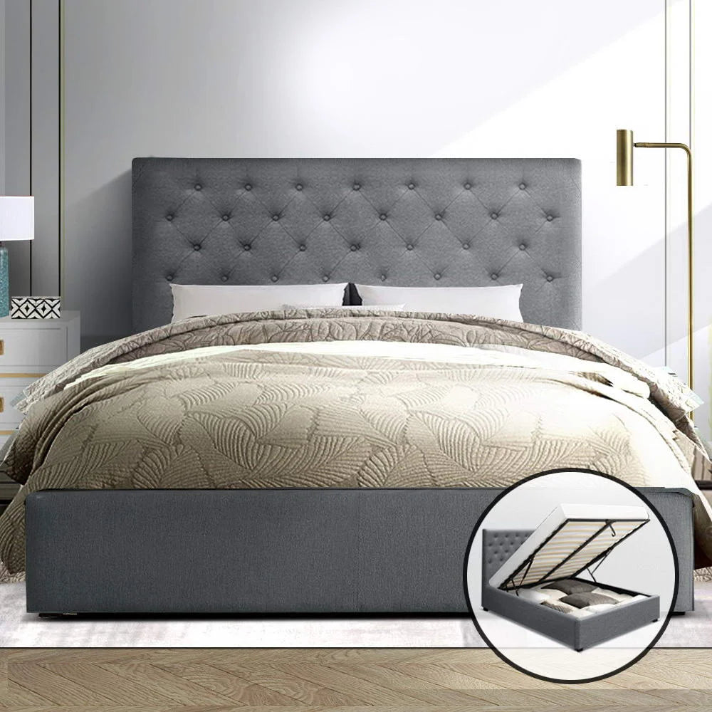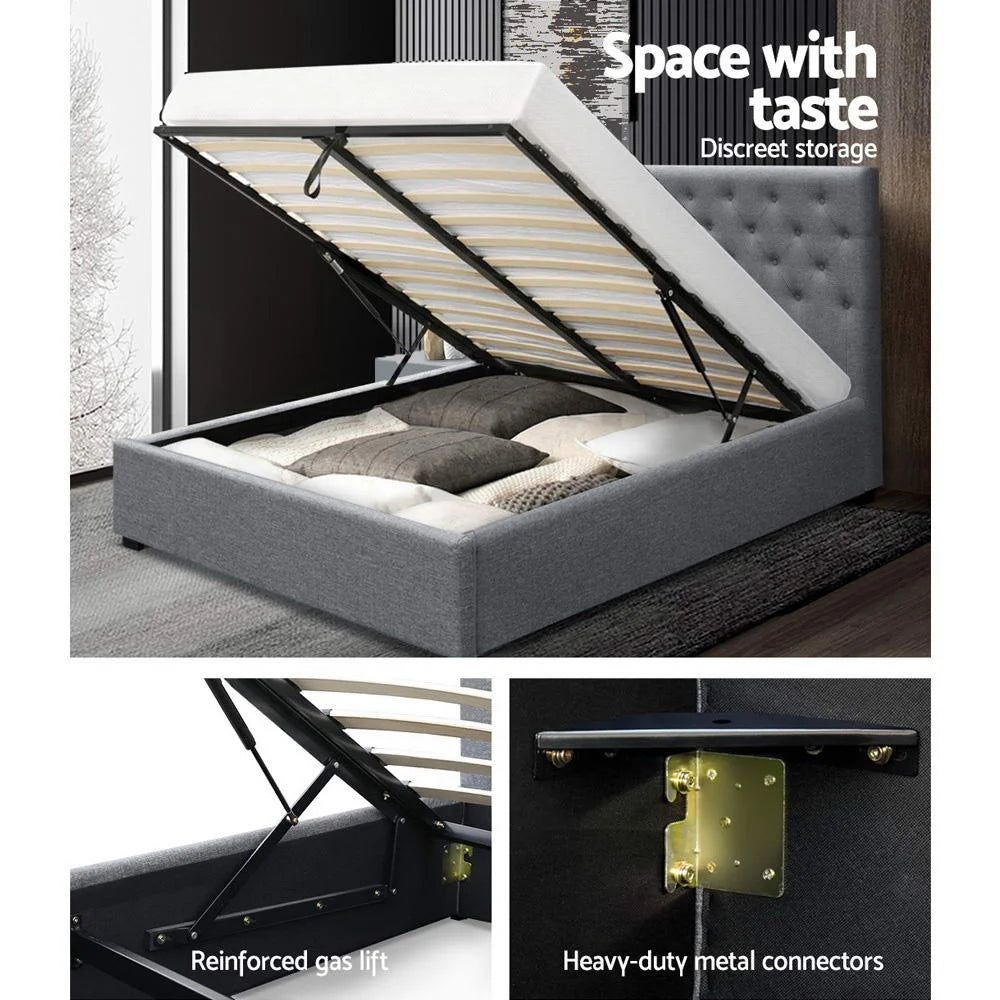 Bed Frame Double, Fabric Gas Lift Storage, Grey