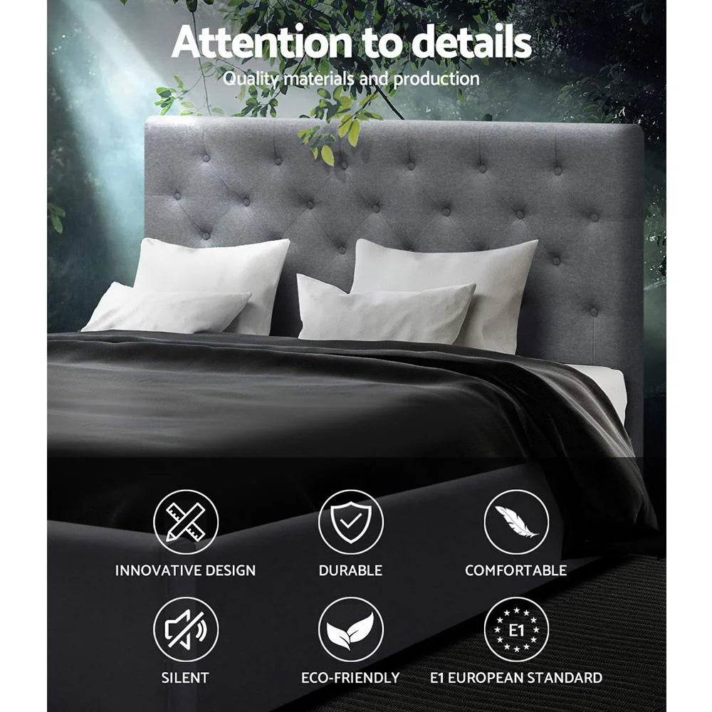 From the outside, our contemporary Artiss Vila Gas Lift Bed Frame looks absolutely plush. The premium linen fabric tufted headboard and sides all exudes fine craftsmanship. But theres more to this luxurious bed frame than meets the eye. Lift up the frame and you will find acres of storage space under the wooden arched slat base. The gas lift system certainly helps to free up existing space in your storage cabinets for other household things.The wooden arched slat base is also designed to flex appropriately so that it can better distribute the weight exerted on it. As such, it helps to minimize movement disturbances created when two persons are sleeping on the bed. Overall, the bed frame is well-built with reinforced steel bars within its sturdy steel frame. Heavy-duty metal connectors keeps the frame sturdy with additional central support from an adjustable centre support beam. Enjoy your wonderful sleep in more ways than one with our innovative Artiss Vila Gas Lift Bed Frame.