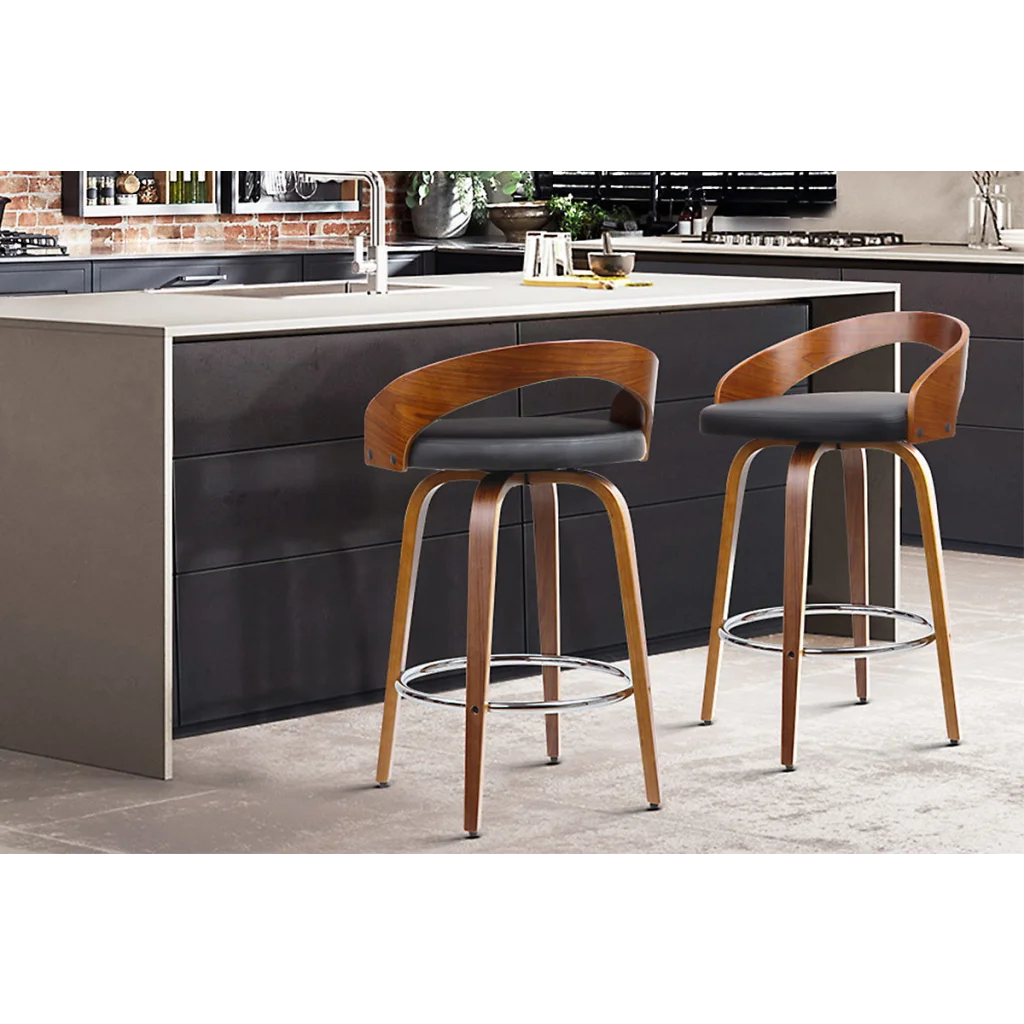 Set of 2 Walnut Wooden Bar Stools- Black Seat